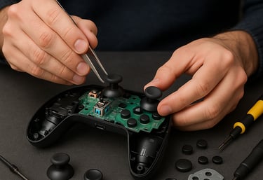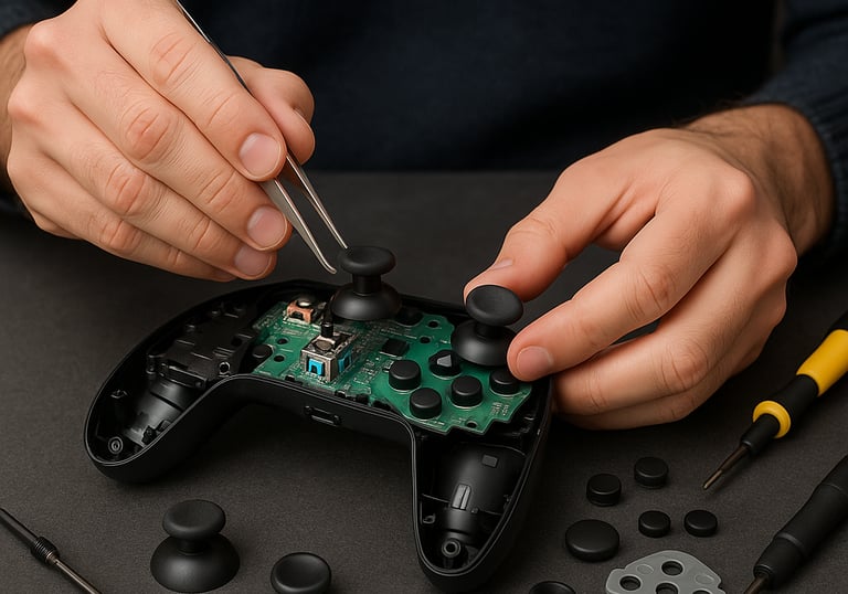 Reparo de controles, incluindo botões e joysticks, garantindo melhor jogabilidade e resposta.