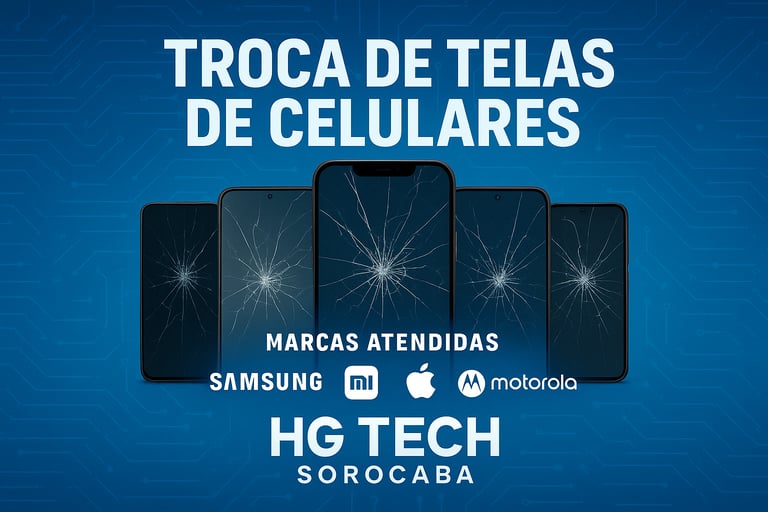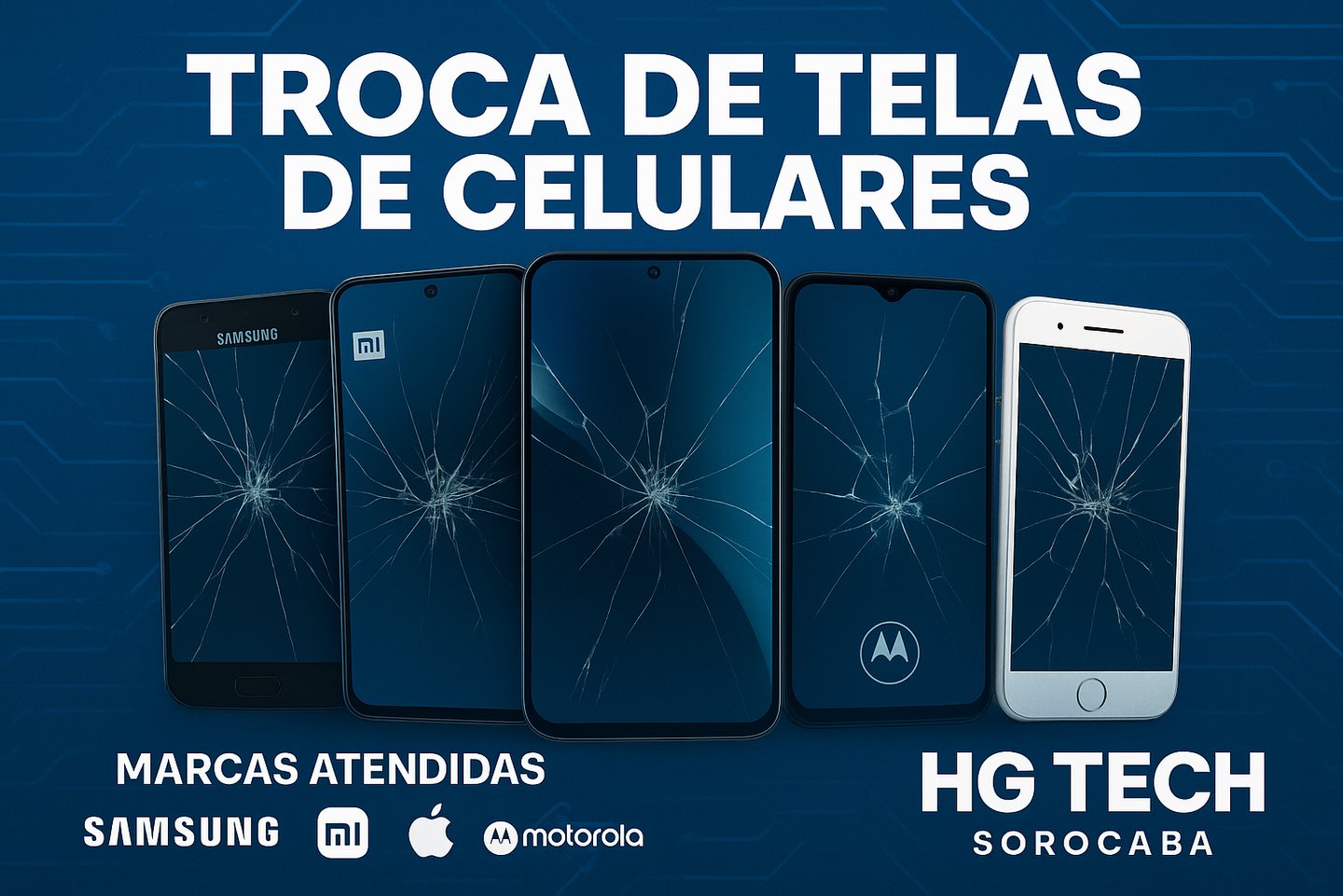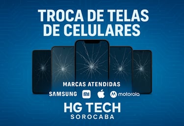 Serviços especializados em troca de telas para celulares Xiaomi, Motorola, Samsung e Apple.